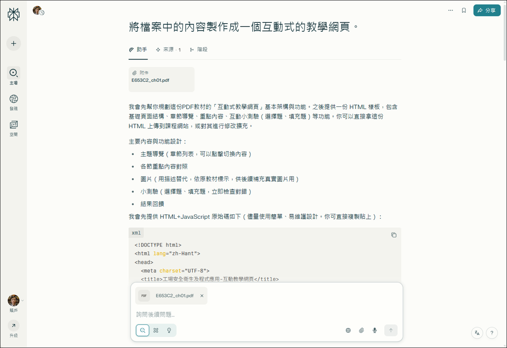 接著,我上傳一個課本的 PDF 檔,希望能作成一個教學網頁。提示詞:將檔案中的內容製作成一個互動式的教學網頁。