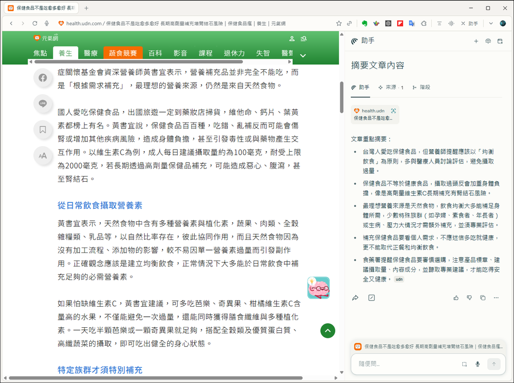 如果你瀏覽了一個網頁,點選右上角的:助手。即可開敨側邊欄位的對話框,在此可以直接發問問題。