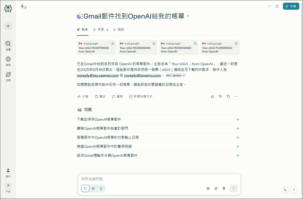 以下來試試簡單的助手功能,例如,我已登入一個 Google 帳號,然後使用以下的提示詞:在Gmail郵件找到OpenAI給我的帳單。