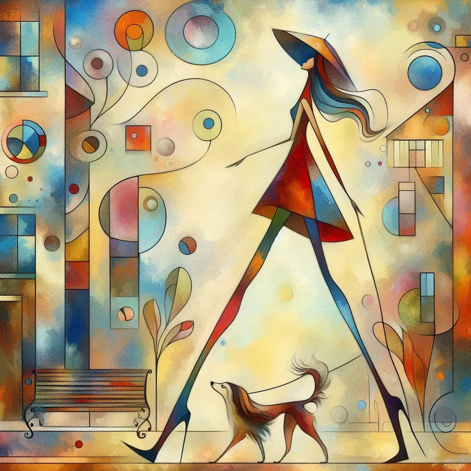 例如,先繪製圖片,提示詞:異想天開的抽象畫風格,大街上的長腿女子帶著一隻狗。