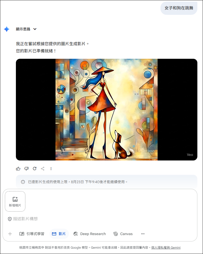 再於 Gemini 中插入圖片,選取「影片」,使用提示詞:女子和狗在跳舞