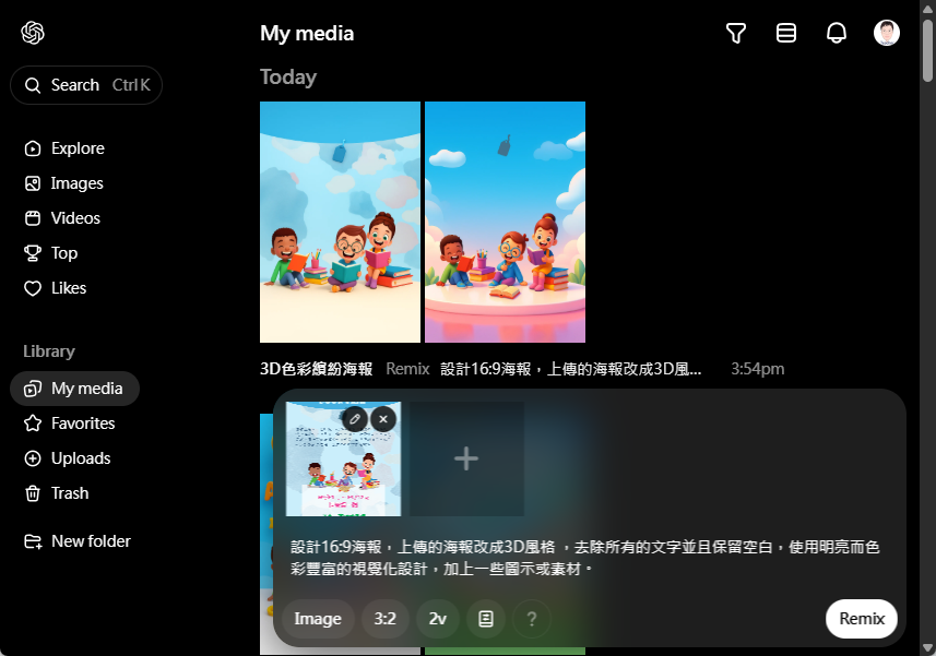 連線 ChatGPT Sora:https://sora.chatgpt.com/,使用時,先選取 Image,再選取長寬比(3:2, 1:1, 2:3),然後輸入繪圖提示詞。可以提供圖檔給 Sora 參考或修圖。