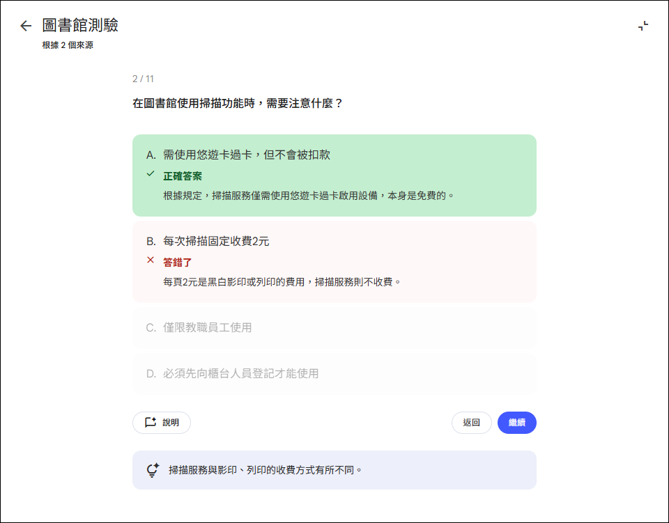 無論是報告簡介、研讀指南、常見問題整理、學習時間軸,還是心智圖、語音摘要、影片摘要,如今都能與學習卡和測驗結合,打造更完整的學習體驗。這些功能設計,正好貼近學生在學習過程中的需求,幫助快速掌握重點、測驗理解程度,進一步提升學習效率。