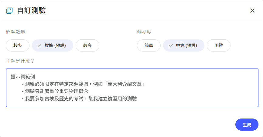 另一個新功能是「測驗」。在 Gemini 的建立功能中,也包含「測驗」。這個功能可以根據所選的來源資料,建立測驗題。並且和和學習卡一樣,可以自訂問題數量和難易度。