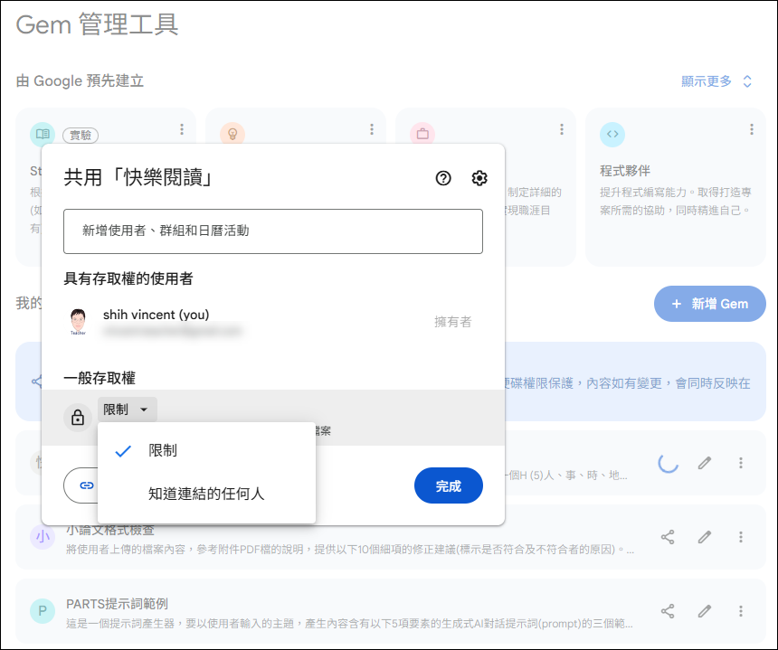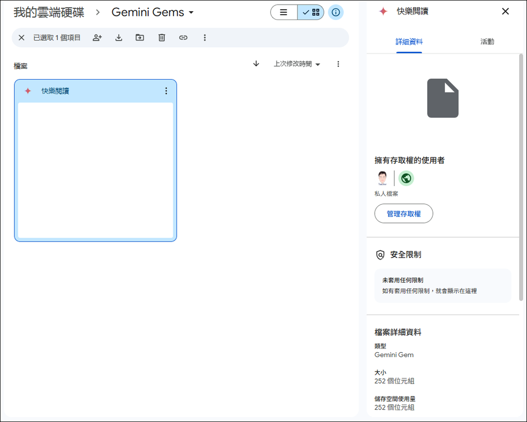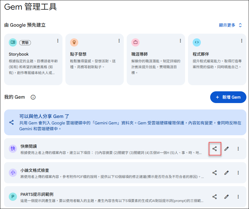 當設定完成後,分享者會在他的雲端硬碟中多了一個資料夾,名為:Gemini Gems,內容放有這個 Gem 的超連結。所以也可以在此也可以分享給他人,在此統一管理所有的分享。