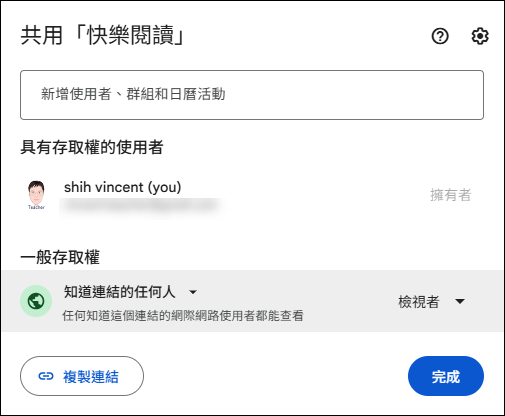 設定分享的存取權限:(1)特定使用者(輸入使用者帳號),或是(2)知道連結的使用人。