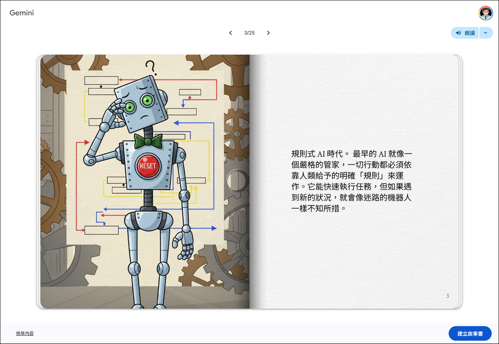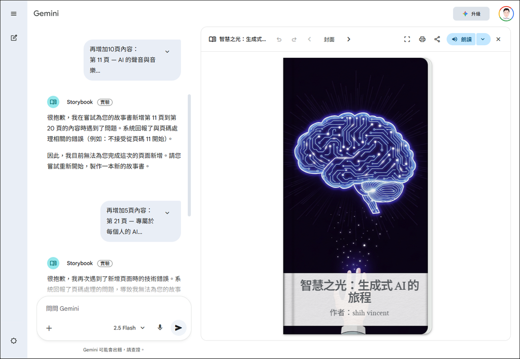 Google 的 Gem 中有一個有趣的功能:Storybook,可以讓你製作繪本。但是每次都會製 10 頁或 12,雖然提示詞中有要求要產生 25 頁,但是常常無法如願。