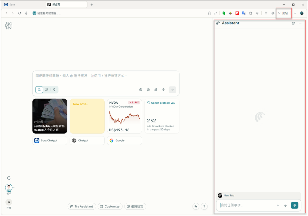 2. 點選瀏覽器中的「助理」,開啟對話框格。