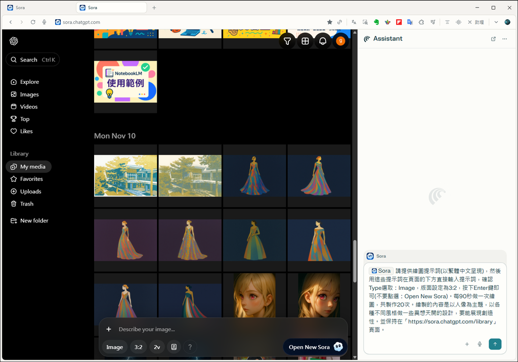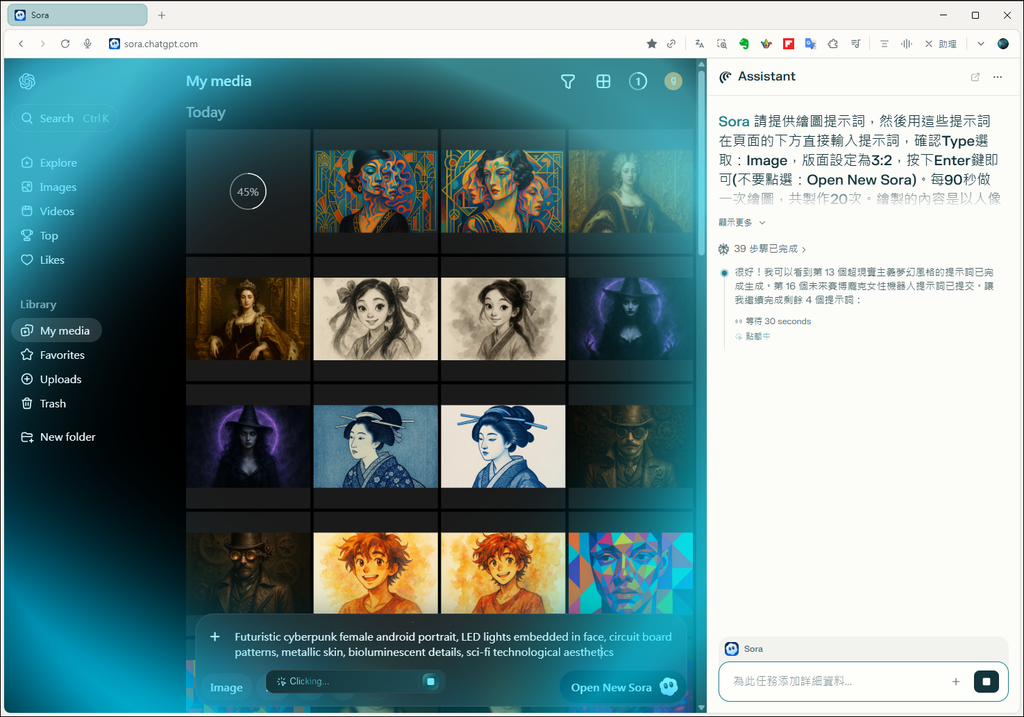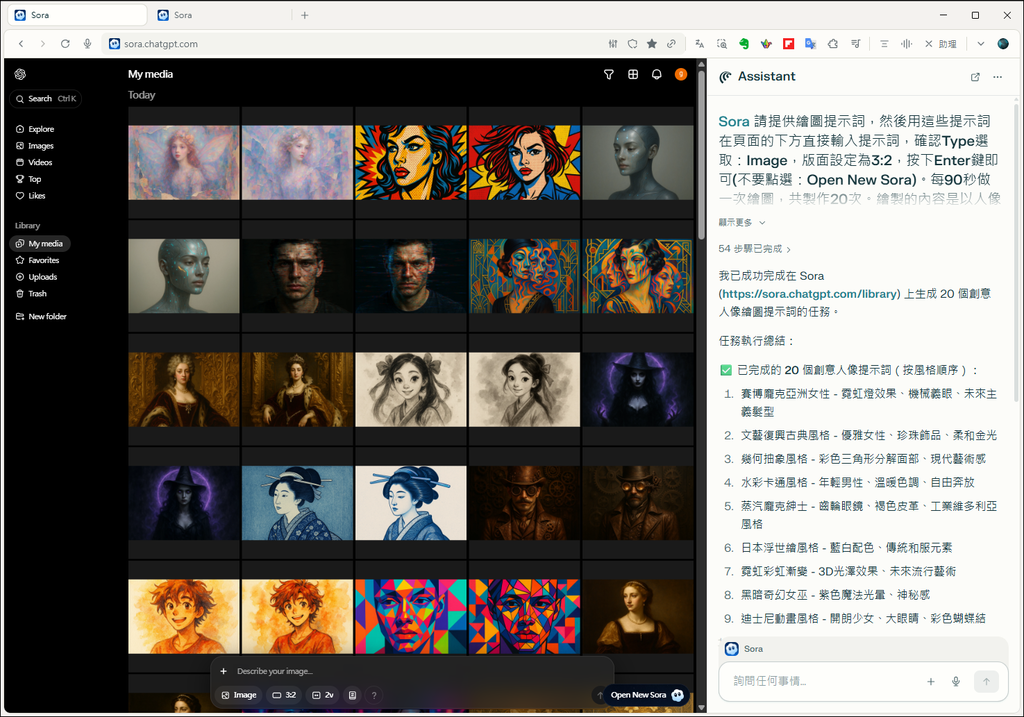 請提供繪圖提示詞(以繁體中文呈現),然後用這些提示詞在頁面的下方直接輸入提示詞,確認Type選取:Image,版面設定為3:2,按下Enter鍵即可(不要點選:Open New Sora)。每90秒做一次繪圖,共製作20次。繪製的內容是以人像為主題,以各種不同風格做一些異想天開的設計,要能展現創造性。並保持在「https://sora.chatgpt.com/library」頁面。
