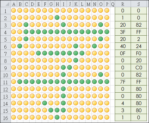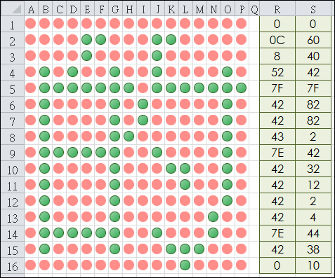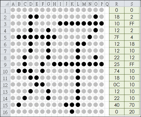 將取得的一個字的字型資料貼至儲存格R1:S16中,在儲存格A1:P16即會顯示該字型,看起來還挺漂亮的。