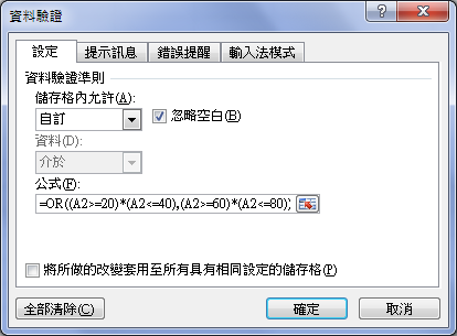 (A2>=20)*(A2<=40):其中「*」為執行 AND 運算,限制儲存格應介於2040之間。